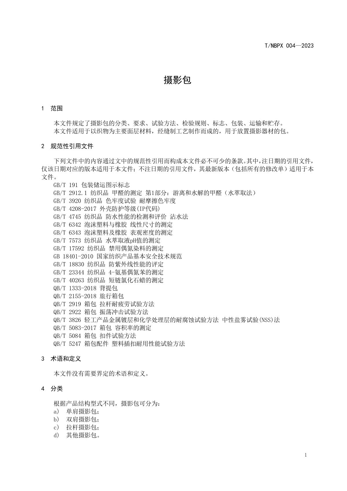 2023年3月30日由寧波市皮革行業(yè)協(xié)會(huì)提出并且歸口,寧波市多家箱包行業(yè)企業(yè)單位共同起草的《攝影包》順利通過驗(yàn)收,本標(biāo)準(zhǔn)將攝影包的各項(xiàng)參數(shù)作了標(biāo)準(zhǔn)化規(guī)定,有助于企業(yè)提升產(chǎn)品質(zhì)量,降低生產(chǎn)成本,提高產(chǎn)品競爭力,同時(shí)也進(jìn)一步促進(jìn)行業(yè)技術(shù)進(jìn)步以及保障消費(fèi)者權(quán)益。